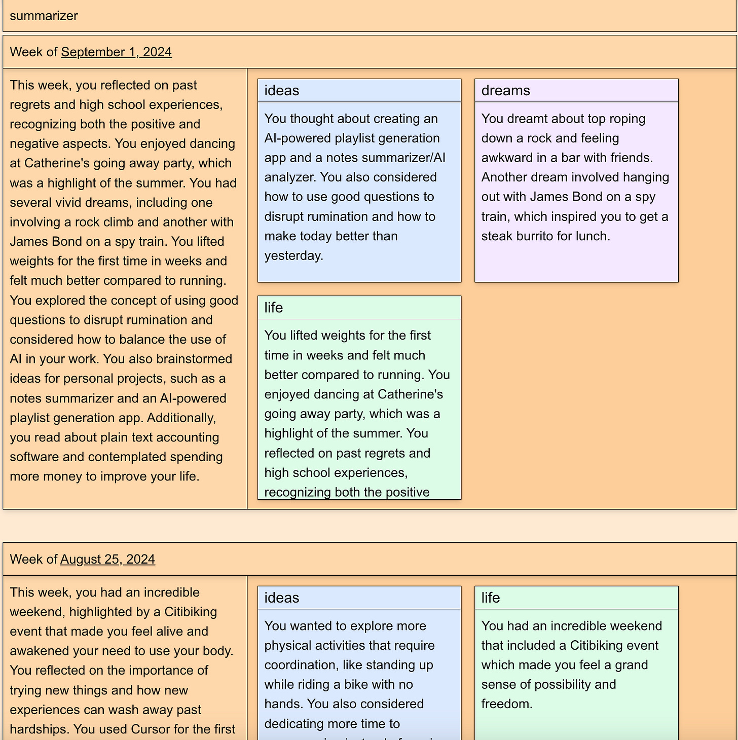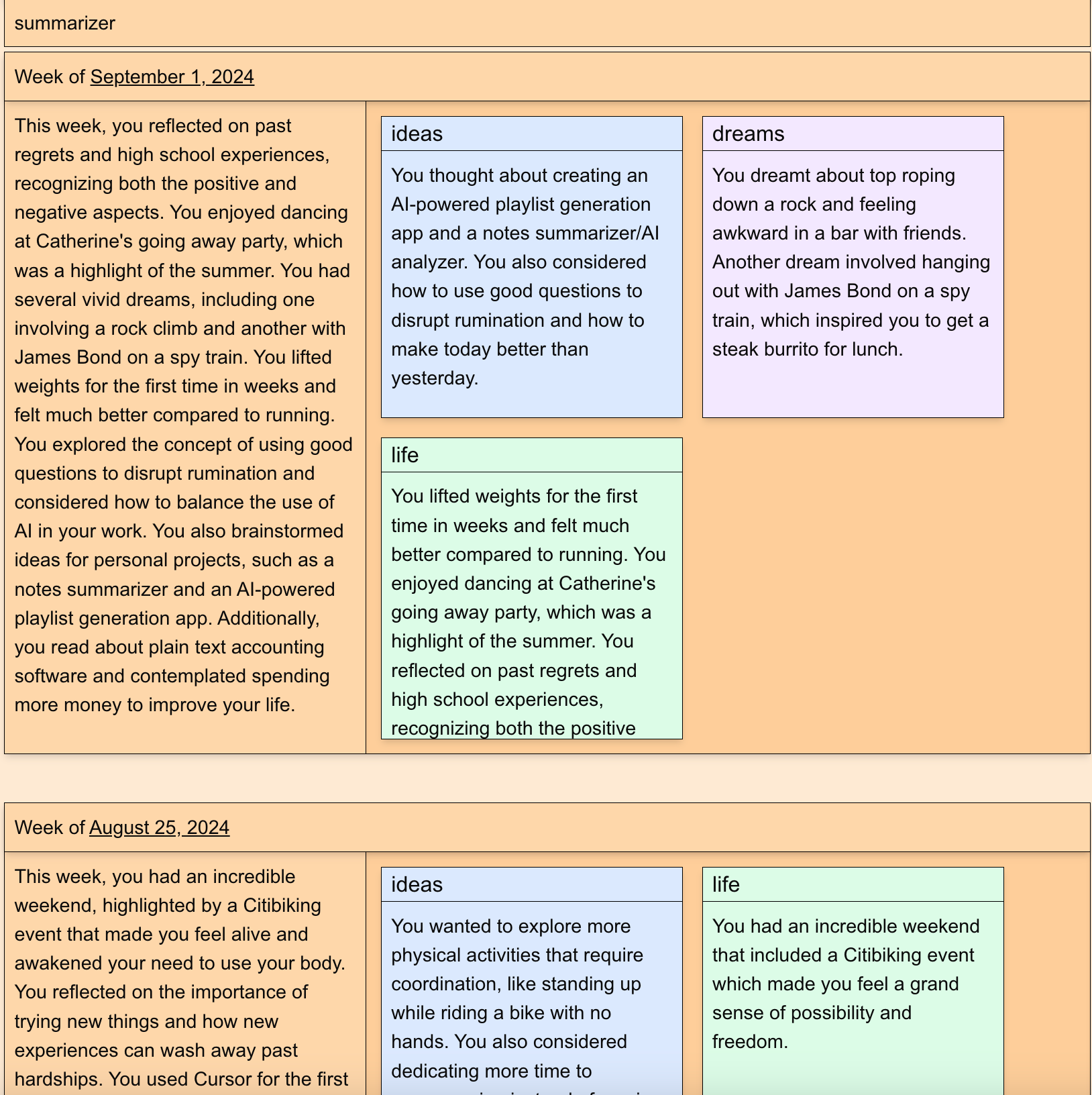 One idea I had to make summaries more legible at a glance was to split them into sections. Instead of outputting a text summary, I had it output multiple summaries: An overall summary, a summary of what dreams I had that week, a summary of the ideas I was thinking about that week, a summary of what was happening in my life that week, a summary of what I was grateful for, etc. To do this, I used GPT4's structured output capabilities and had it output a JSON object with multiple fields, one for each summary.
