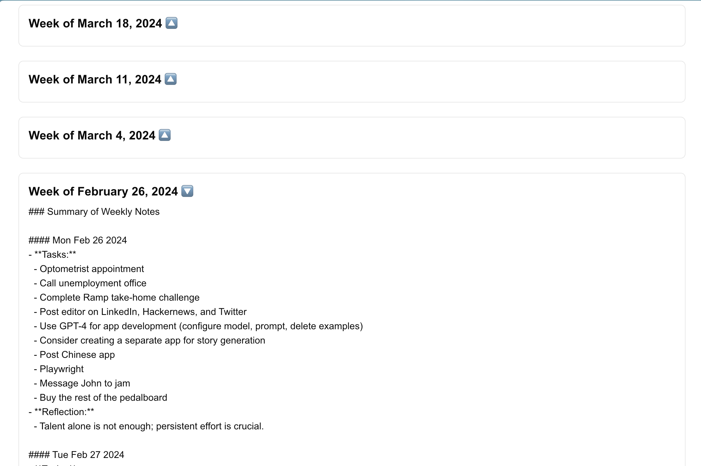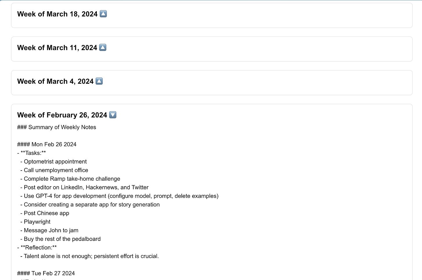 I'm excited about building other features on top of summaries. Having accessible plaintext weekly summaries make a variety of other use cases possible - one idea I had was to use something like Exa Search's API to curate a reading list based off what I've been journaling about recently.